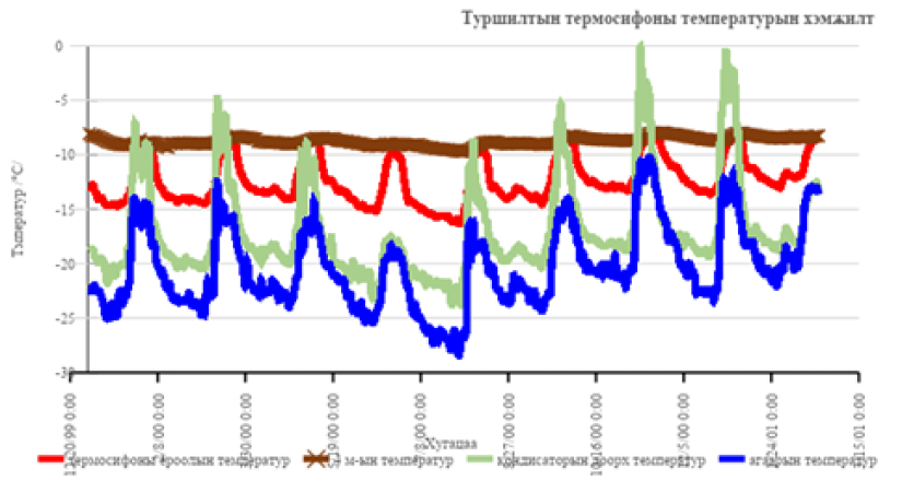 몽골 조건에서 테스트된 열사이펀 파이프 테스트 결과 중 일부는 다음과 같습니다.