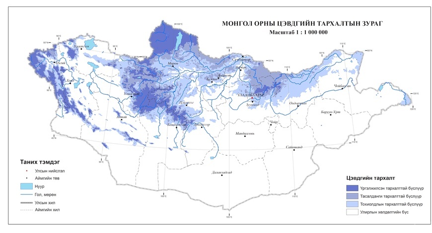 Zavkhany Otgon, Telmen 및 Tudevtei 합계는 연속 얼음 분포 벨트에 있습니다. 그러나 분포가 불연속적인 지역에는 5개 도 18개 자치구가 있다. 그들 중 하나는 Zavkhan 지방입니다. 또한 몽골의 솜은 대부분 230솜으로 중부 계절의 결빙대에 위치하고 있다. 그러나 2008년부터 2016년까지 Tsevdeg 현장 조사의 모니터링 측정 및 현장 조사 결과에 따르면 Tsevdeg에는 Tosontsengel, Telmen, Nümrog, Otgon, Tudevtei, Tsetsen-Uul 및 Yaru sum Zavkhan의 센터가 있습니다.