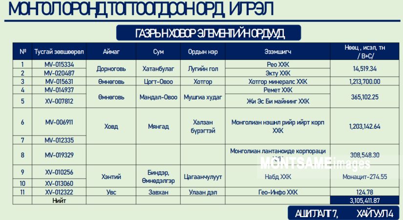 오늘날 광업 및 국유 기업 그룹인 Erdenes Mongolia LLC는 우리나라의 희토류 원소 문제를 담당하고 있습니다. H. Badamsuren , 몽골 산업 명예 노동자, 기술 과학 박사는 현재 몽골 대통령 인 U. Khurelsukh가 총리 재임 중에 결의안을 발표하고이를 노조에 할당했다고 밝혔습니다.