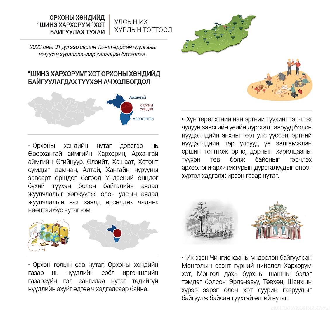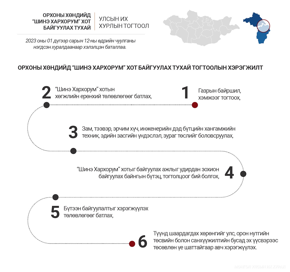 위의 State Great Khural 결의에 따라 "Orkhon Valley에 "New Harkhorum"도시 설립에 관한" State Great Khural 결의안이 승인되었습니다.