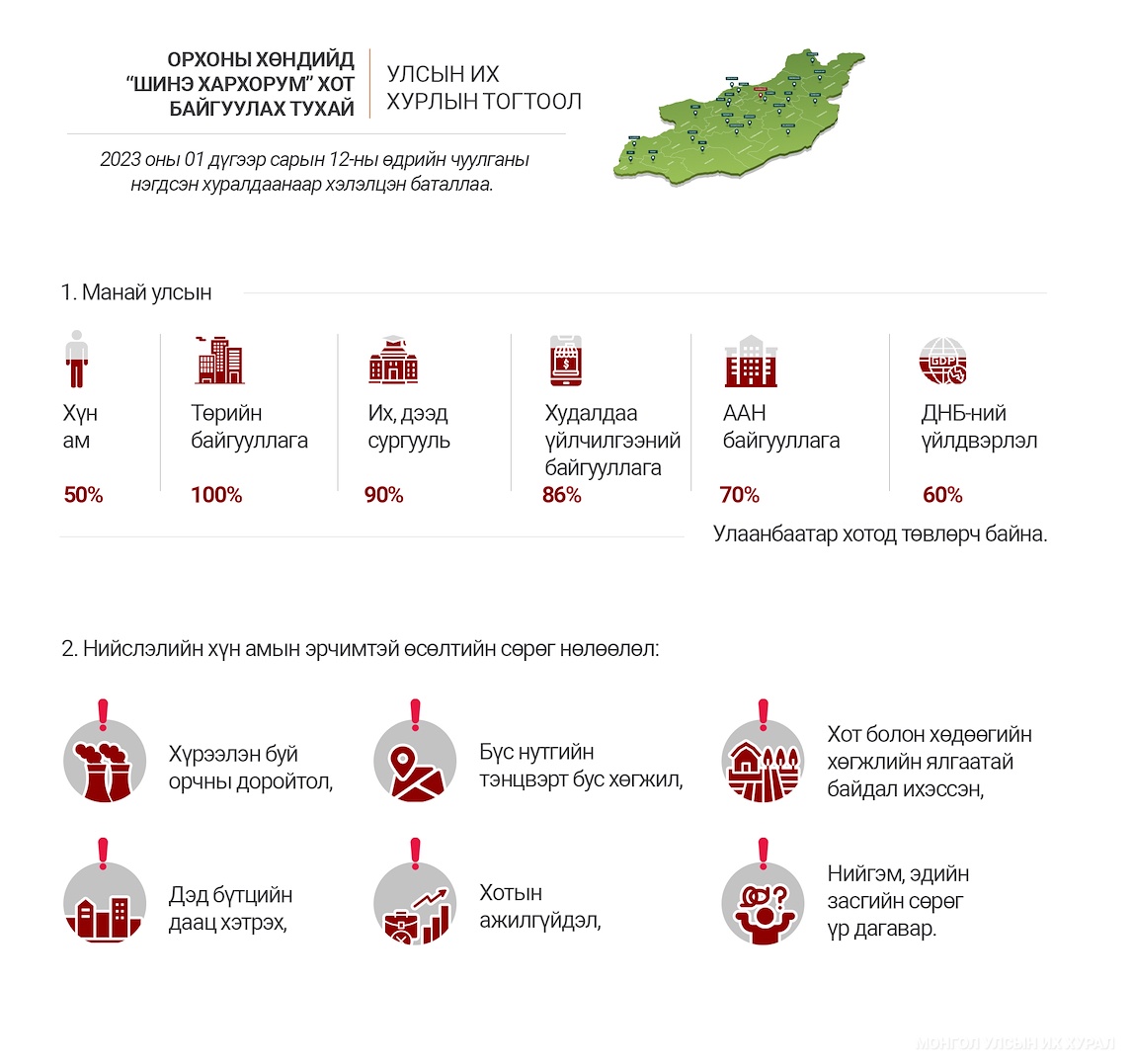 2023년 1월 3일 몽골 정부가 주 의회에 제출한 "오르콘 계곡에 도시 설립에 관한" 주 의회 결의안 초안이 1월 12일 주 의회 총회에서 논의 및 승인되었습니다. 2023.