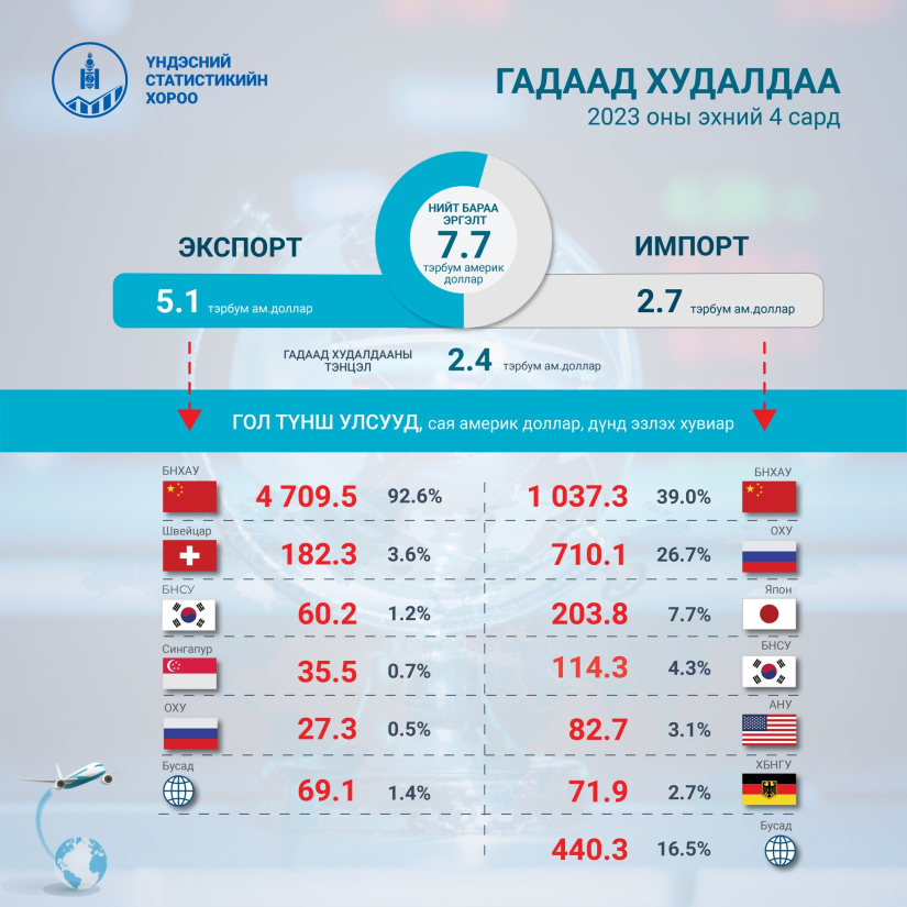 올해 첫 4개월 동안 몽골은 134개국과 무역을 했으며 대외 무역액은 77억 달러였습니다 . 그 중 수출액은 51억 달러, 수입액은 27억 달러입니다 . 불화.