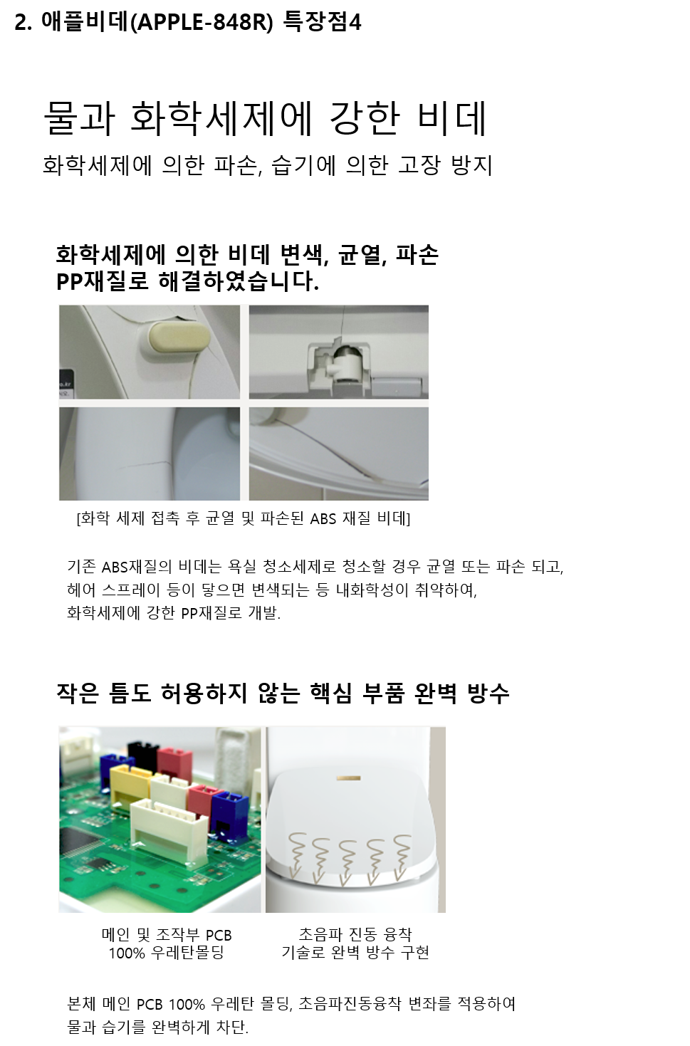애플의 비데 제품은 공공기관시장은 물론 호텔, 리조트, 아파트 등의 모든 숙박,주택시설의 고급욕실에는 항상 애플비대가 설치 납품되고 있을 정도로 기술력과 가격경쟁력은 물론 우수디자인 제품으로 고객에게 인정 받고 있다.