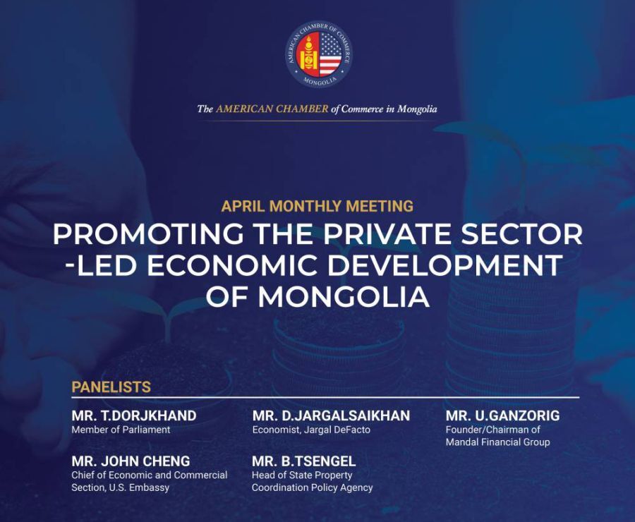 몽골의 미국 상공 회의소 (AmCham Mongolia)는 몽골의 민간 부문 주도 경제 발전을 촉진하는 4 월 월간 회의를 조직했습니다. 이 행사의 패널리스트는 T. Dorjkhand, 독립적 인 경제학자 D. Jargalsaikhan (Jargal DeFacto), Mandal Financial Group U. Ganzorig의 설립자 겸 회장, John Cheng 미국 대사관의 경제 및 상업 부문 책임자 및 국가 재산 조정 정책 기관 B. Tsengel의 책임자였습니다. 월례회의는 대면과 가상의 하이브리드 형식으로 진행되었으며, AmCham 커뮤니티 대표, 외국 및 국내 투자자, 외교 관계자 및 언론인을 포함하여 80 명이 넘는 사람들이 참석했습니다.
