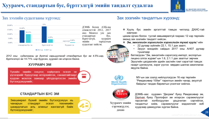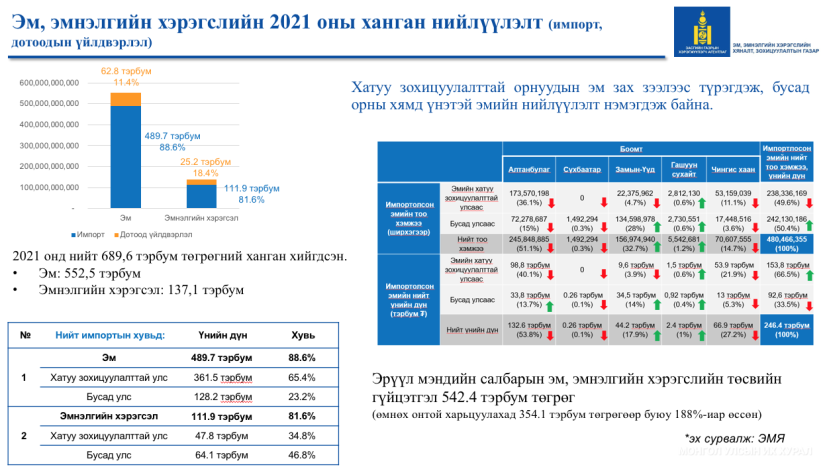 이와 관련하여 의약품 및 의료 기기의 통제 및 규제 부서 책임자 인 D. Narantuya가 정보를 제공했습니다. 그의 정보에 따르면 2022년 10월 5일 현재 총 4,310개의 의약품이 몽골 의약품 등록부에 등록되어 있습니다. 그는 전체 약품의 21%가 국산 약품이고 79%가 수입품이며 3,407개의 등록된 수입 약품 중 3,338개(98%)가 유럽 약품이고 69~2%가 전통 약품이라고 지적했다.