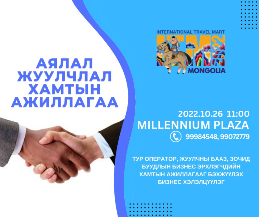관광 전시회 " ITM 몽골리아-2022 " 가 오늘 개막했습니다. 올해 "미셸 엑스포"에서 3일간의 관광 전시회는 "새로운 부흥 - 관광"을 주제로 개최됩니다.