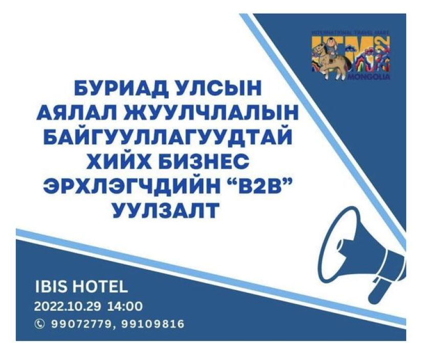 정부 가 내년 '몽골 방문 의 해 '로 발표한 것과 관련 하여 올해 박람회 의 틀 내에서 해외 관광기관 과의 공동 B2B 또는 대면 회의를 개최 한다. 관광 기업 및 조직 의 비즈니스 및 활동 .