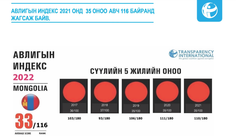 ATI는 국가 정부 기관의 부패에 대한 인식을 0 /매우 부패함/에서 100 /매우 깨끗함/으로 평가했으며 우리나라는 33점을 받았습니다 . 몽골 은 2017년 부패지수 에서 36점을 받아 180개국 중 103 위 , 2018년에는 93위를 기록했습니다 .2019 년 106위 , 2020년 111 위 , 2021년 110 위, 2022 년 116위에 올랐다.