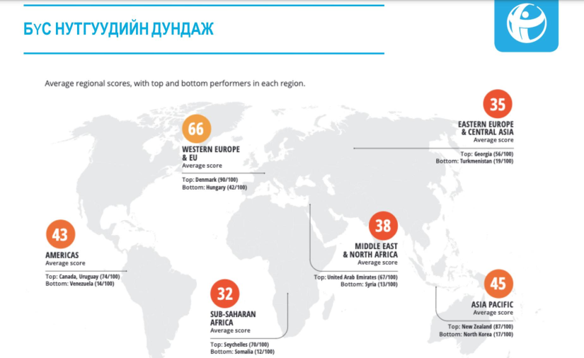 매년 Transparency International은 부패 인식 지수를 발표하고 의견, 여론 조사 및 증거를 기반으로 연구를 수행합니다 . 2016년에는 176 개국이 포함되었고 지난 5년 동안에는 180 개국이 포함되었습니다. 세계 16 개 출처와 몽골 8개 출처를 사용하여 A vlig 지수를 결정합니다 .