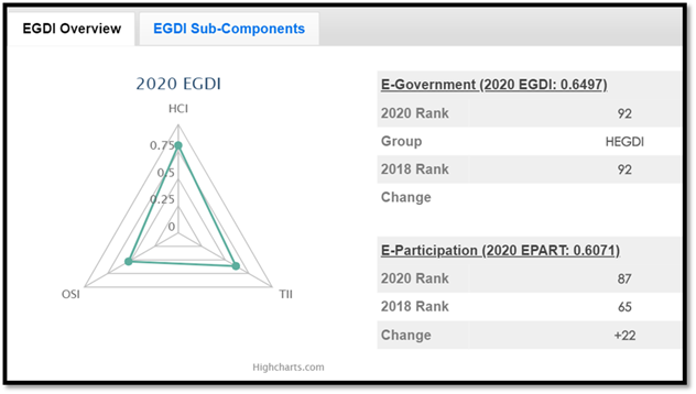 몽골 정부의 15년간 노력에도 불구하고 몽골의 ‘전자정부발전지수’는 중위권에 속해 있다. 유엔경제사회처(UNDESA)에서 2년마다 193개 회원국을 대상으로 전자정부 발전수준과 참여수준을 평가하는 ‘유엔전자정부평가’ 2020년 8월 발표 보고서에 의하면 몽골은 전자정부발전지수 부문 총점수 0.6497점으로 92위, 온라인참여지수 부문이 0.6071점으로 87위 수준이다.